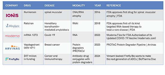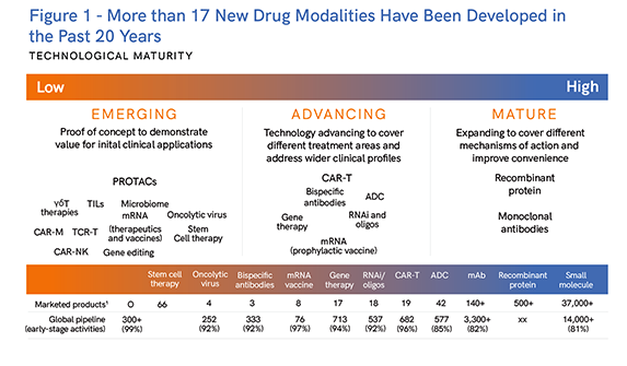 However, despite the risks, the ability to address previously untreatable conditions or to provide more effective treatments for existing conditions opens vast potential markets. Companies that successfully develop new modalities can establish themselves as leaders in new therapeutic areas, creating strong – and possibly exclusive – competitive advantage. Advancements in these areas often lead to patentable innovations, providing valuable assets in a highly competitive pharmaceutical industry (see Table 1).