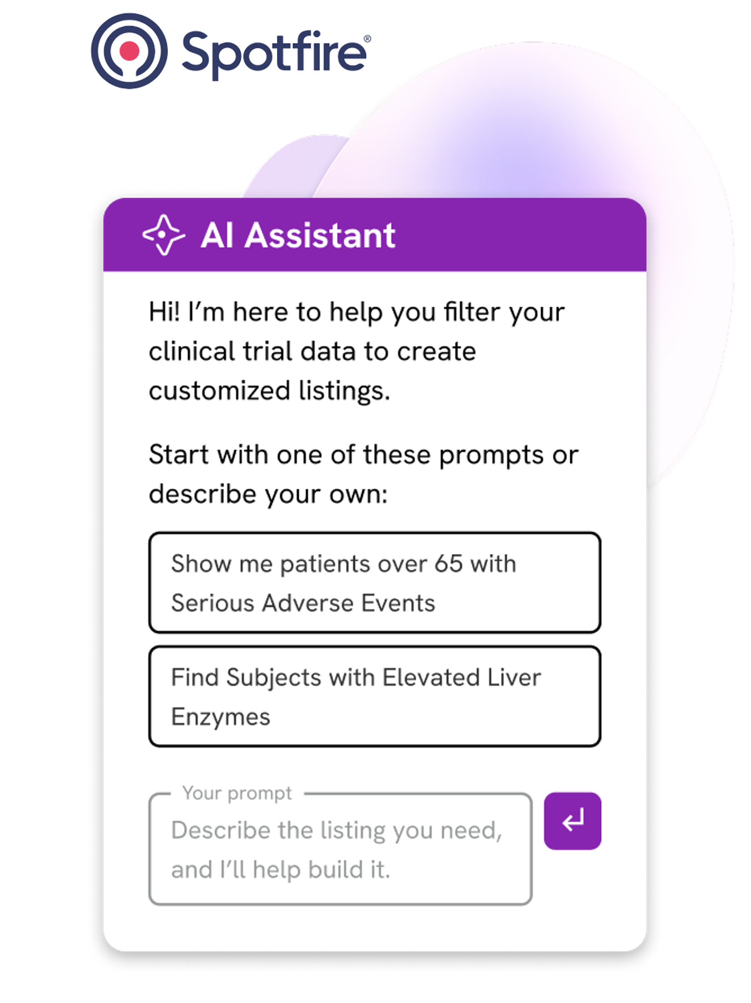 Bring your listings, queries, and medical monitoring into one AI‑assisted workspace so you can analyze studies flexibly, streamline review, and maintain compliance‑ready oversight all with Spotfire® built in.