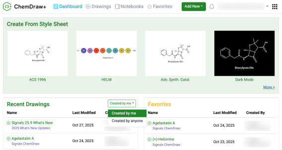Use the new ‘Created by’ filter on the ChemDraw+ Dashboard to control what appears in Recent Drawings. Select ‘Created by me’ to see only recently modified drawings that you created (not ones shared by other users). Select ‘Created by anyone’ to see all recently modified drawings you can access in your account.