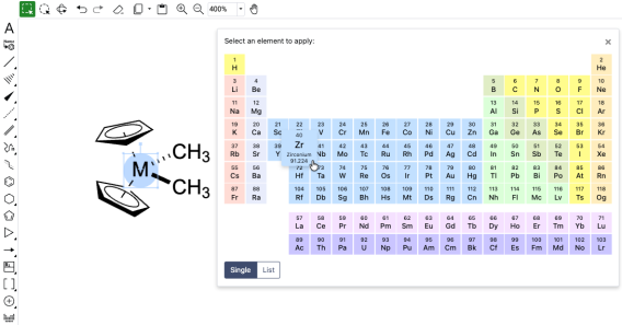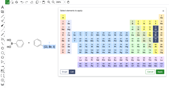 Creation of atom lists for the generation of generic structures is now also possible with the new periodic table tool. Upon opening the tool in ChemDraw, users can select List which will allow the selection of multiple elements. Once the list is generated, selecting 'Apply' will allow the user to place the atom list on the canvas in brackets.