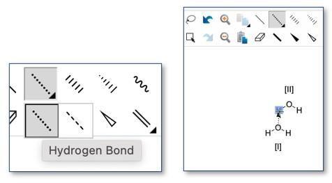 Selecting CTRL (PC) or CMD (Mac) before resizing a selected molecule will resize from the center of the molecule rather than the opposite corner. There is a new dotted bond option to specifically define a Hydrogen Bond. The Hydrogen Bond is drawn in a defined direction. Exported mol 3k files represent the Hydrogen Bond specifically in the bond block.