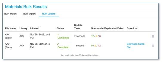 After the update completes users may view a report and download an error file. There is a new section of the Material Bulk results to capture each update run.