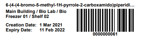 A new 32 by 17 mm label template is available for containers in 1-D barcode or QR code and allow selection of additional properties to be included in the label.