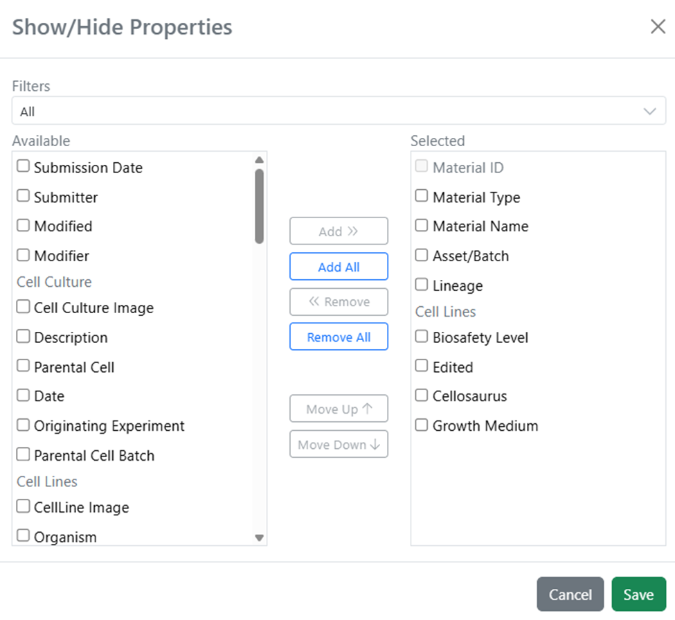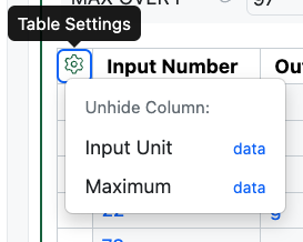 End users can now temporarily display hidden columns in relevant Tables even if they do not have Edit on the content the Table is in. The Cog icon will now be shown and will display in blue if hidden columns contain data. The hidden columns can be exposed from this menu. The display of the columns is transient and the table will be returned to its original state upon a page refresh. This applies to all relevant tables including Admin Defined Tables, Variation Tables, Hierarchical Tables, Design Tables, Sample Tables and Material Tables.