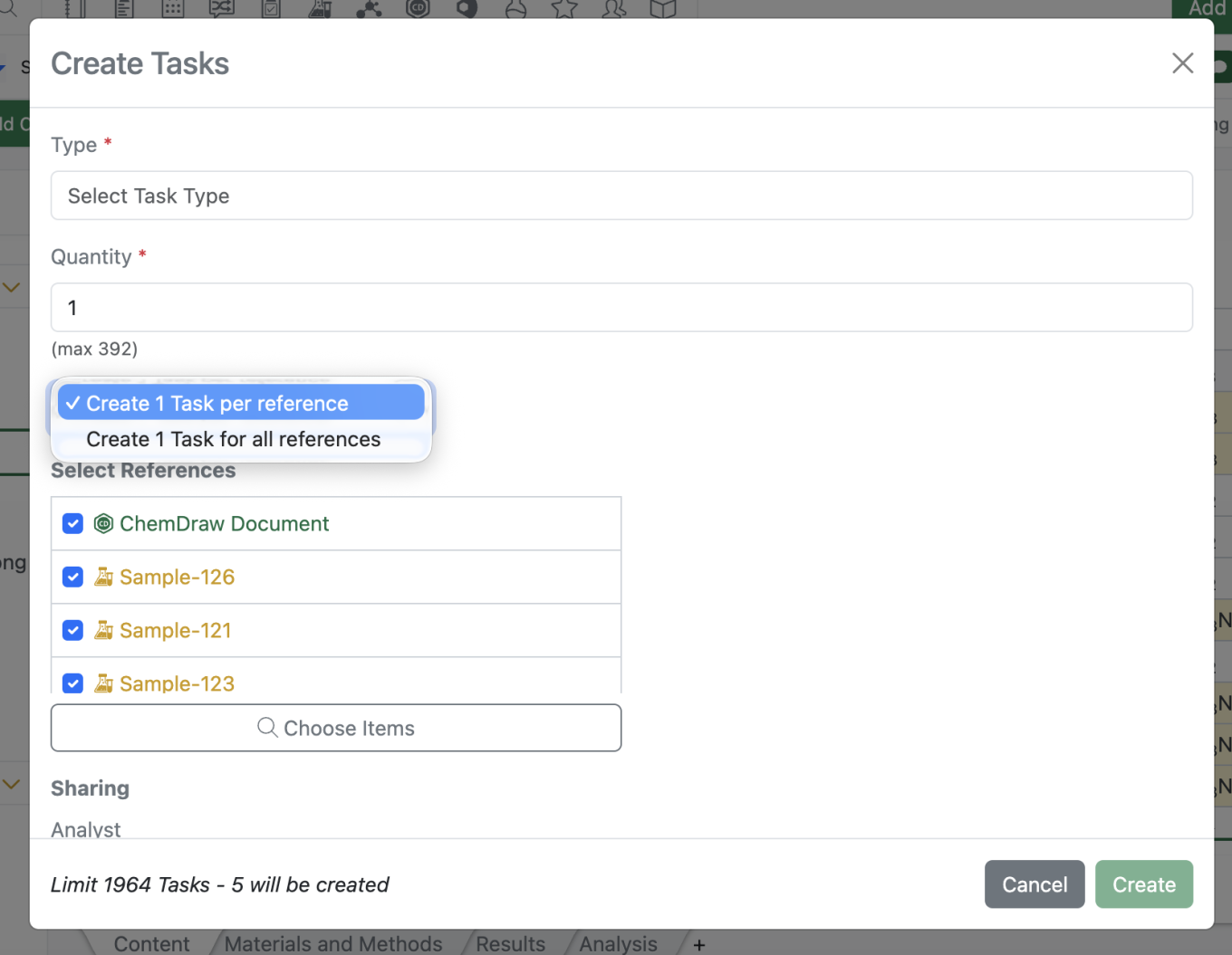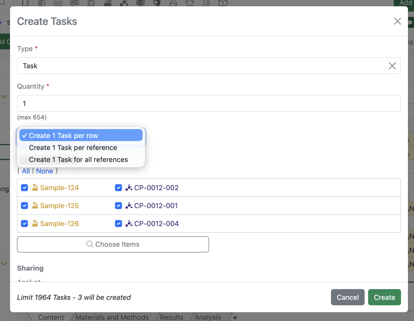The Task creation modal has been updated to more clearly indicate the number of tasks that will be created and allow for a single task to include all references from the Sample Bulk actions as seen below.