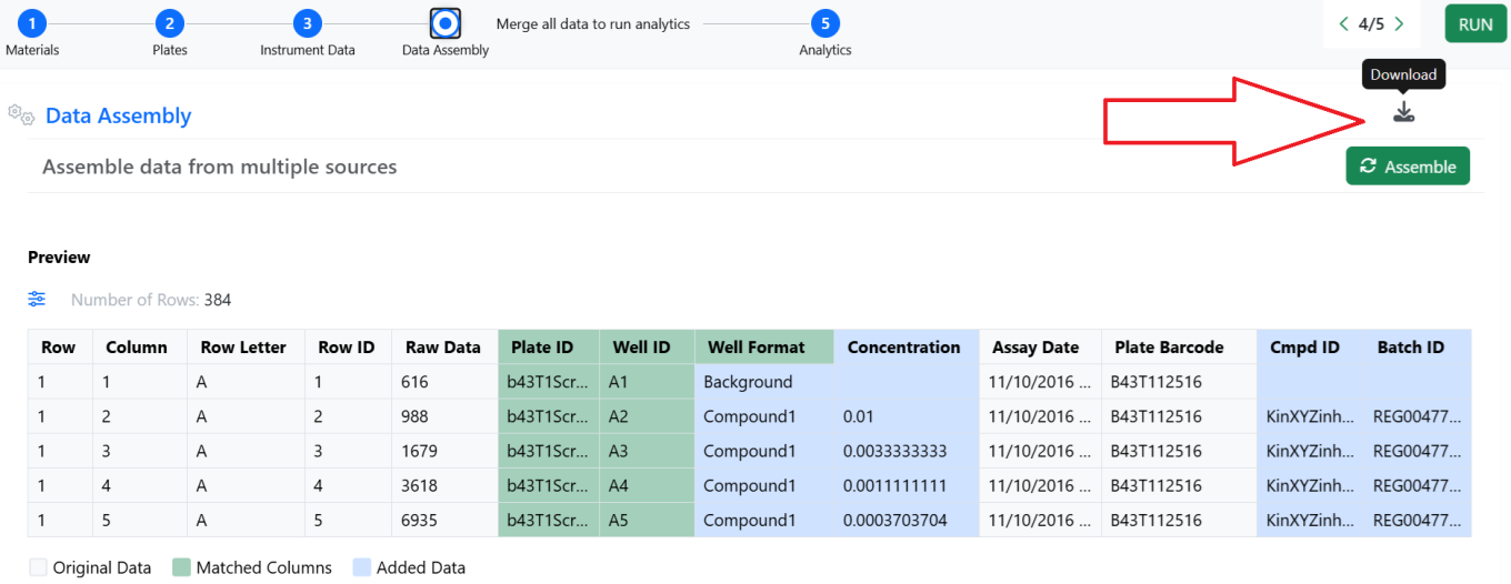 The Data Assembly step of the In Vitro Analysis allows assembling the data from the instrument with multiple sources like plate format information and external lookup tables. It is now possible to download, with the click of a button, the full content of the resulting table.