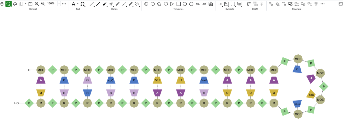 The ‘auto-pair’ tool in the ChemDraw editor can now generate hairpins from a single oligonucleotide sequence. It identifies the region of maximum complementarity within the strand, places hydrogen bonds between complementary nucleobases, and forms a hairpin loop from the remaining unpaired nucleobases.